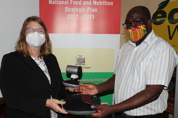 The donation includes a video conferencing unit, projector and projector screen; nutrition card game and animated video on nutrition; and printer. While some of the items will enhance communication and behavioral change in relation to the Scaling Up Nutrition programme which has an overall objective of reducing stunting in Zambia, the video conferencing system shall support NFNC capacity to operate under the new normal.